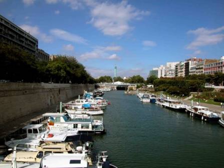 Beside the Cathedral is the Bishops Palace, built in 1138 and now a very good museum. The Abbey of Saint Remi, who christened Clovis, was founded in the 8th century and the Basilica built in the 11th century. These are not in the center of the city and there were no tourists there when we visited. I dont know why I go on about these places, because there is no way I can describe their magnificence and the feeling I get to be in that history and architecture. Perhaps it may inspire some of you to see it for yourselves, if you have not already done so. Reims, at the north end of the Champagne region of France and, together with Epernay, is one of the principal centers for the big champagne houses. Now, although it may seem like sacrilege, we are not big fans of champagne. However, during the summer in Reims there were concerts all over the city almost every day, mostly free. One of the ones we attended was in the garden of the Mumms champagne firm and, being early for the concert, we decided to take the tour. The grapes thrive in the chalky ground of the region and the wine is produced and stored in the cellars carved from the chalk. The Mumms cellars extend over a distance of 25 km (16 miles) eight meters below the ground and contain 25 million bottles of champagne. I wont go into detail about the production process, but it is long and complex, which accounts for the high price of champagne. The process is automated in the big companies, but they still produce a small quantity every year that is produced using the old methods. This does not result a higher quality product, just a higher price and a fancier label. We left Reims after five days. We might have spent longer but the freeway ran along the other side of the canal from the marina and the on and off ramps went right over our heads, so it was very noisy. At the next village we met our Dutch friends, Dick and Emmy, on their way back home from Paris. They have a beautiful 50 foot boat and we rafted against them for the afternoon and overnight, saying farewell after breakfast at they headed north and us south. It was great to see them again and catch up. We stopped a five villages and towns in the Champagne region. Each was surrounded by vineyards and there were many small producers in each place. In one really small village there were 27 champagne wineries. We might have visited some, but it was expected that we should buy a least one bottle and, as we already had one bottle on board, we demurred. Hautvillers is a village perched on top of a hill, a one hour steep climb on a hot day. The photo at right is one view from the village across the vineyards. Here Dom Pérignon, a monk in charge of the cellars of the Benedictine abbey was the first to blend three wines and to use a double fermentation process to produce a sparkling vintage. He is also credited as the first to use corks in the bottles. We visited his grave there, explored the village and had a Belgian beer at the café. Leaving the vineyards, we proceeded down the picturesque river Marne, stopping at the City of Meaux, known for its brie cheese, which was wonderfully ripe and flavorful. Passing through the suburbs of Paris the Marne joins the Seine and fifteen minutes later we were at the lock to the Canal Saint Martin.